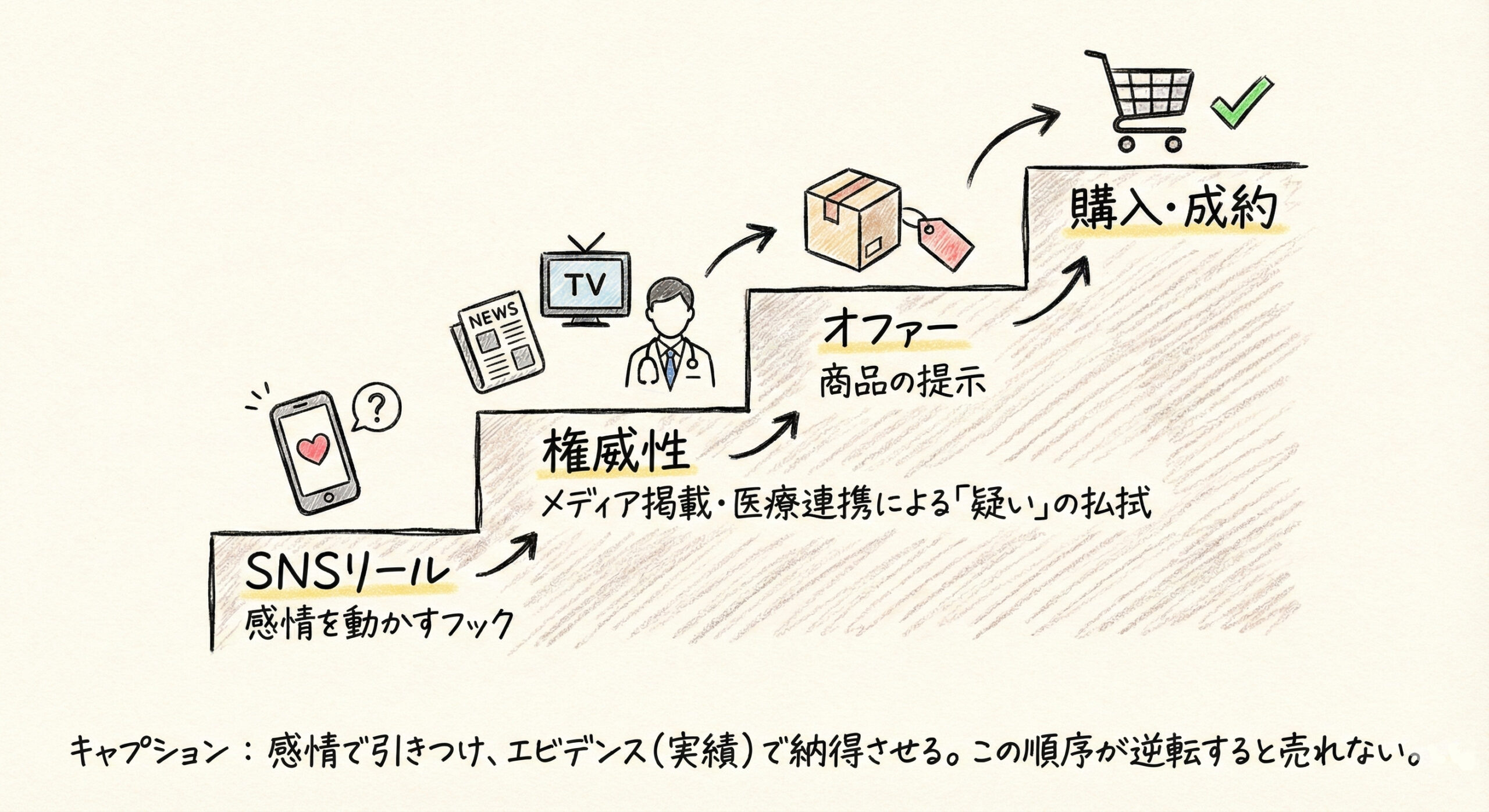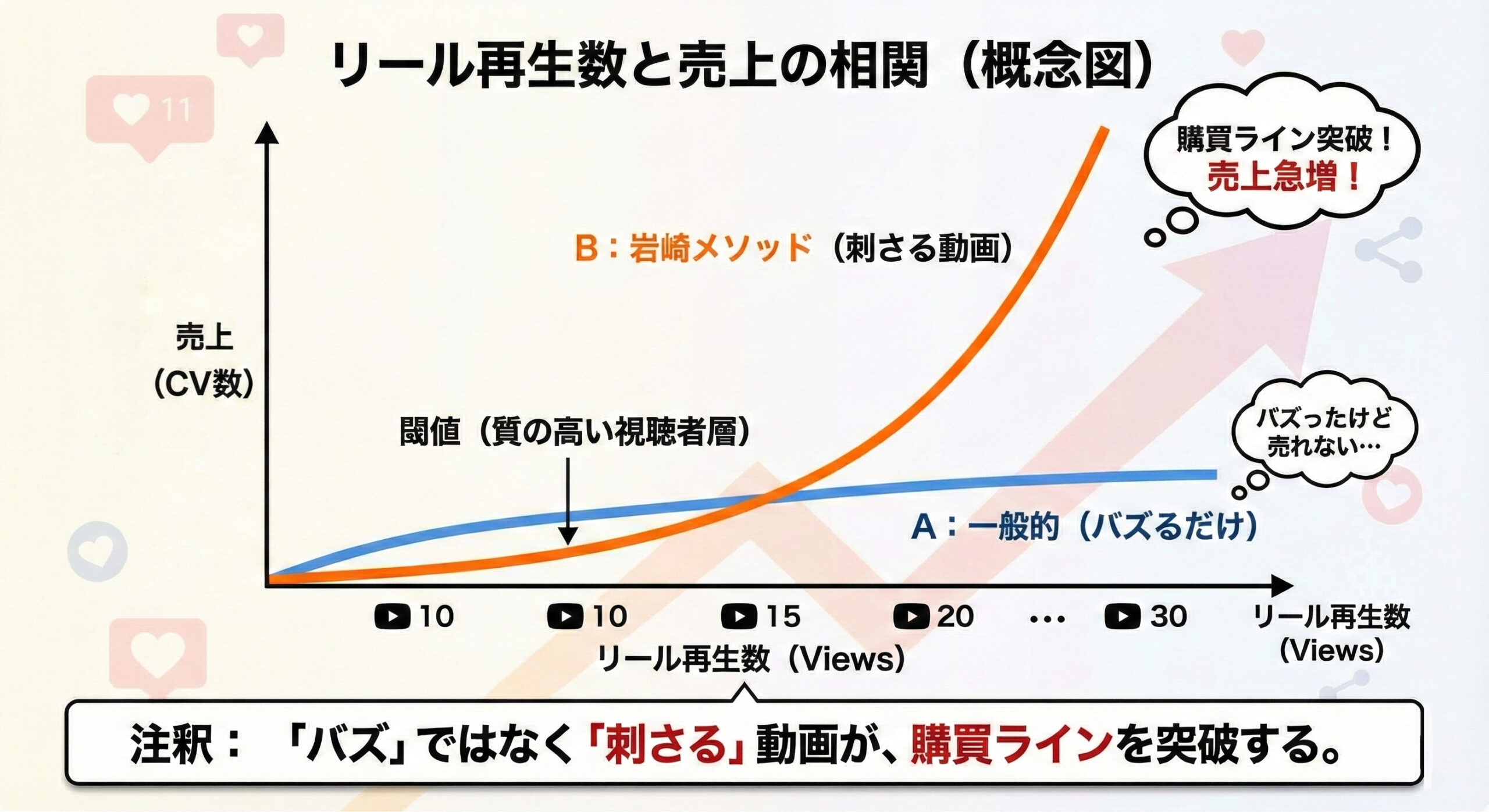 SNS、特にInstagramやTikTokの「リール動画」における最大の誤解は、「再生数が多ければモノが売れる」という思い込みだ。 岩崎のメソッドは異なる。リールは「商品の必要性に気づかせるためのフィルタリング装置」として機能させる。